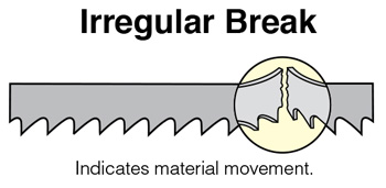 - Material moved in vise - Inspect and adjust vise, and use nesting clamps. If the material being cut is not held tightly, and the material is allowed to spin or vibrate, tooth breakage (fracture) due to the material hitting the back of the band saw blade usually results.