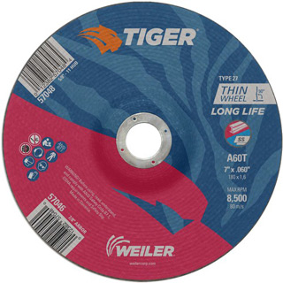 Tiger Aluminum Cutting Wheels are specifically designed for high performance cutting on aluminum. These wheels blend abrasive grains with Weiler Abrasive’s non-loading formula, resulting in a fast and consistent cut rate on aluminum.