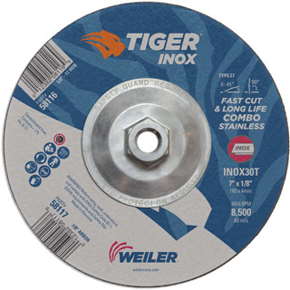 Tiger Aluminum Combo Wheels deliver true flexibility and efficiency when switching between cutting and grinding aluminum applications. These wheels blend abrasive grains with Weiler Abrasive's non-loading formula, resulting in a fast and consistent cut rate on aluminum.