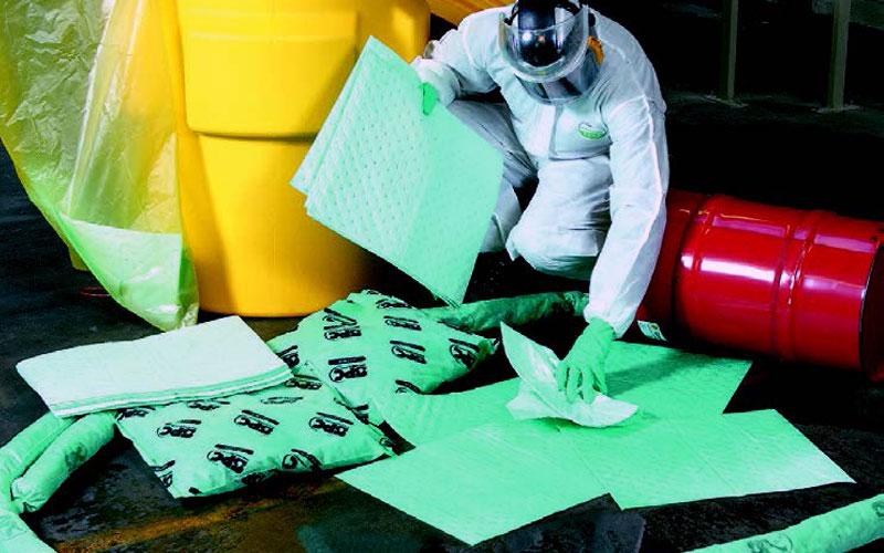 Industrial absorbents and spill containment products help you keep your employees and work environment safe from unexpected spills, leaks, drips or other accidents. Absorbent products are ideal for any indoor, outdoor and or hazmat application. Absorbent spill kits and stations can be placed around machinery, and throughout your facility to ensure a clean, safe, and compliant work environment. The risks associated with accidental spills and leaks, which range from chemical exposure to slip and fall accidents, can be mitigated by fast and efficient response times. Having absorbent products on hand and readily available, and having a pre-determined spill response plan, allows you to be prepared to quickly contain a spill and clean up both quickly and effectively. When a spill occurs, take the following steps.